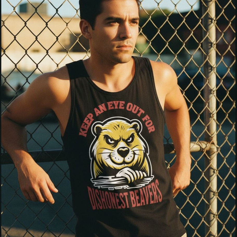 The Dishonest Beavers tank top drops a gnarly rodent mid-scheme, framed by the warning: Keep an Eye Out. It’s shady, it’s sharp, and it’s sleeveless for max ventilation during maximum suspicion.