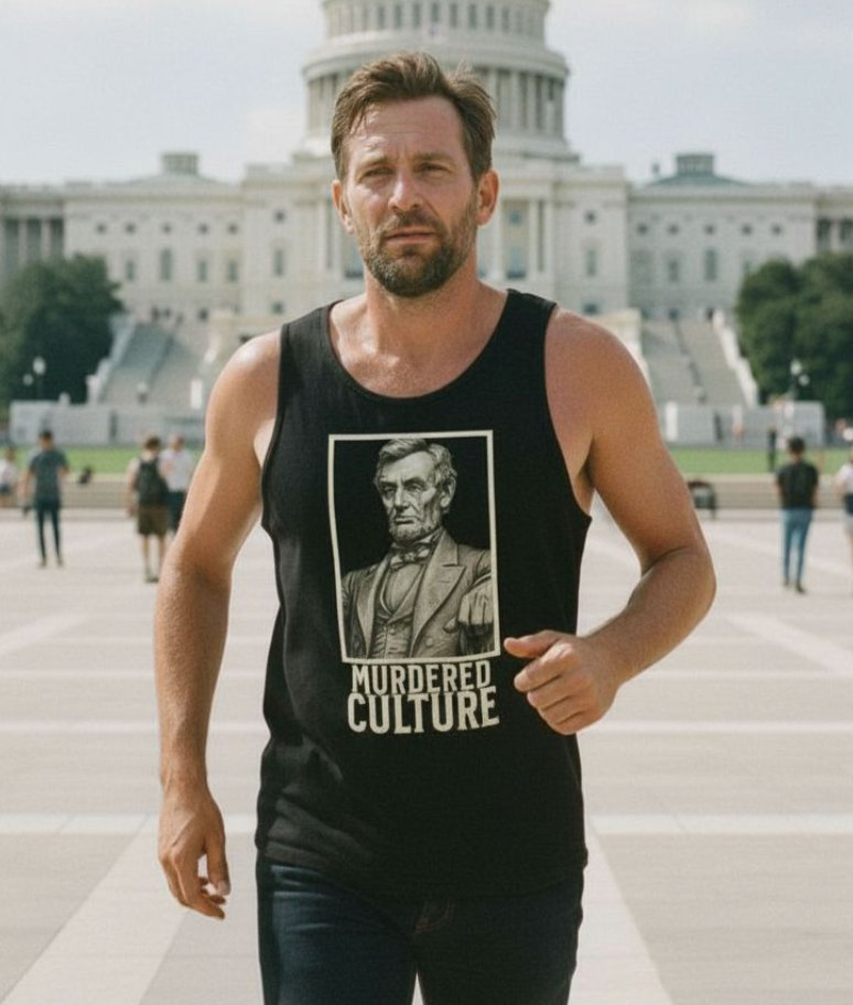 The Lincoln’s Lament tank top showcases a solemn portrait of Abe with a single tear of blood cutting through stone — a brutal symbol of a nation’s broken promises. Stripped down and sleeveless, this piece mourns with muscle.